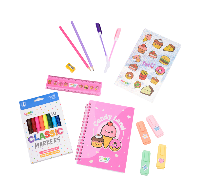 Contiene: 1 anotador de 60 hojas ,2 rollers de tinta gel en colores surtidos, 4 mini resaltadores , 2 lápices de grafito , 1 sacapuntas, 1 regla de 15 cm 1 plancha de stickers holográficos , 1 estuche por 10 marcadores